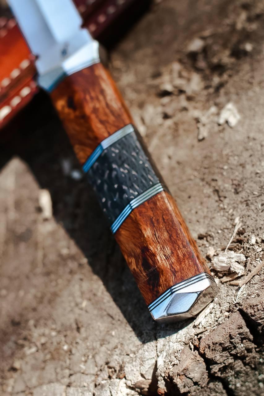 - Рукоятка з дерева айронвуд, по середині вставка карбон, монтаж на стяжку